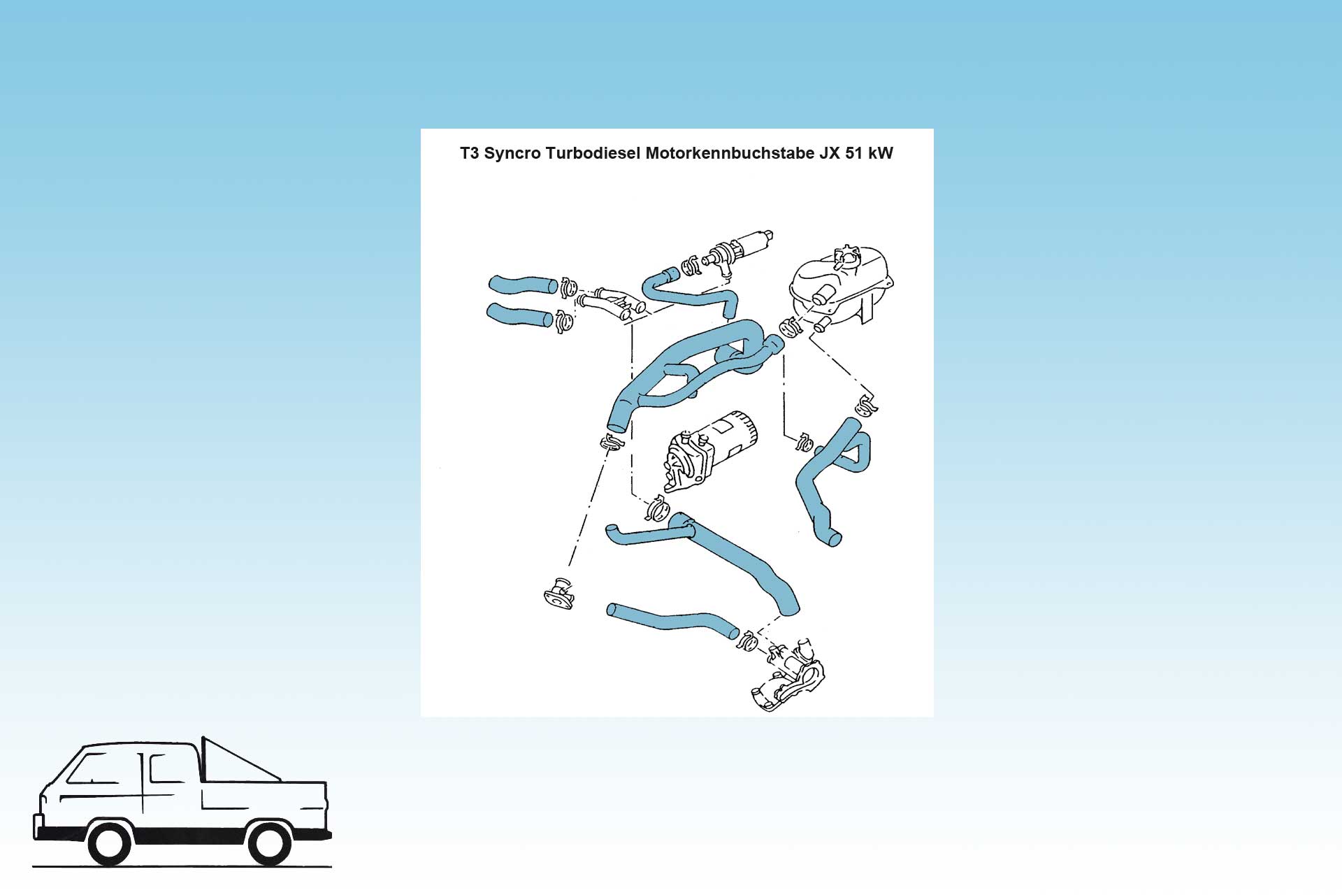 1 Satz Wasserschläuche ( 7 Stück ) am Motor für alle T3 Syncro mit Turbodieselmotor ( Kennbuchstabe JX ). Im einzelnen bestehend aus dem Schlauch am Zylinderkopf; dem Schlauch zur Zusatzwasserpumpe; dem Rücklaufschlauch zur Wasserpumpe; dem Schlauch zum Ausgleichsbehälter, den Schläuchen vom Verteiler zum Vor- und Rücklauf Kühler und dem Schlauch unterhalb des Zylinderkopfes -