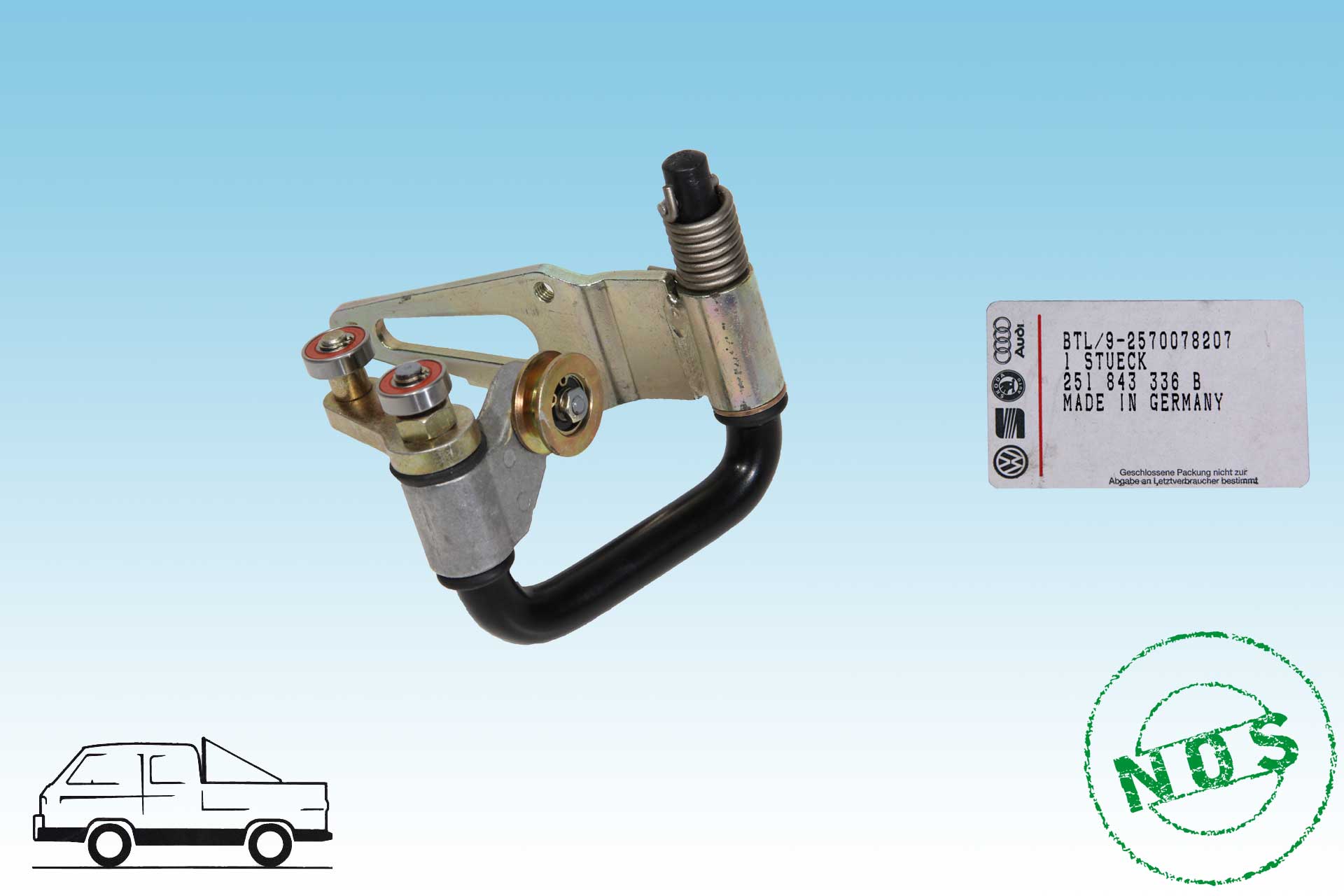 Scharnierbügel rechts T3 ( Rollenwagen ) für die späte Schiebetür ab Modell `85 ( kurzer Schiebetürgriff / kleines Fenster ) - orig. VW